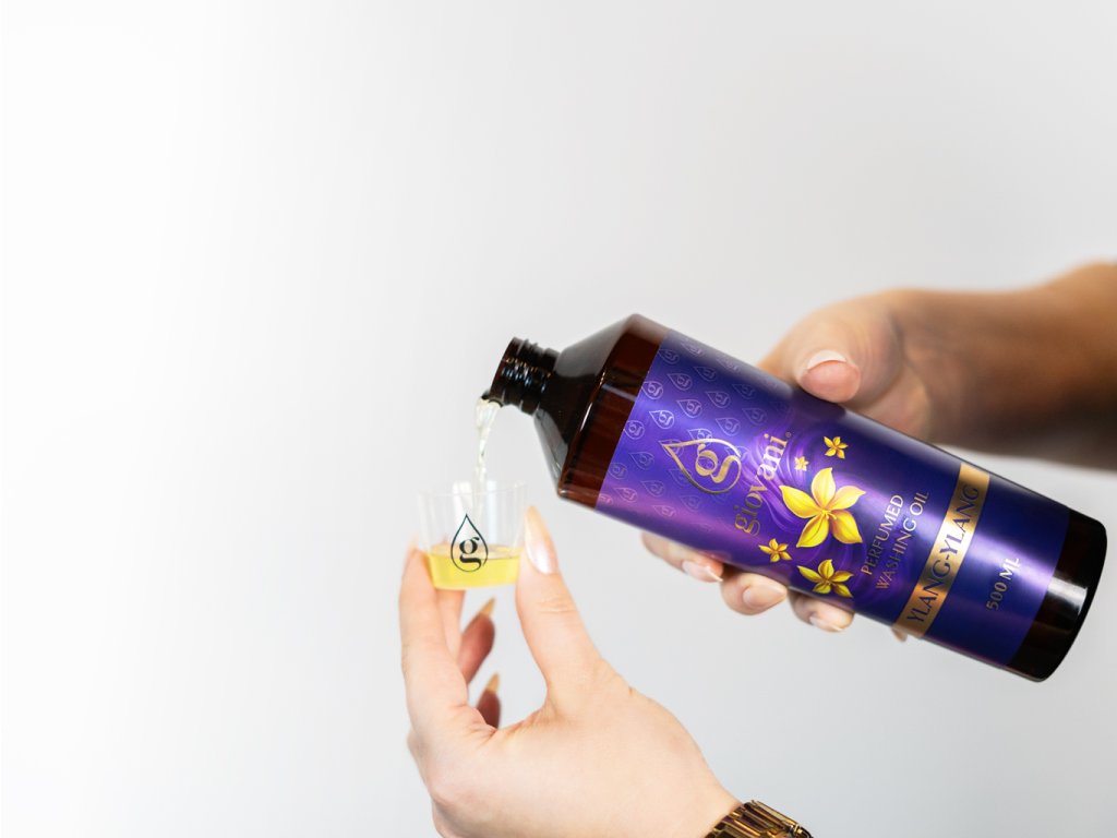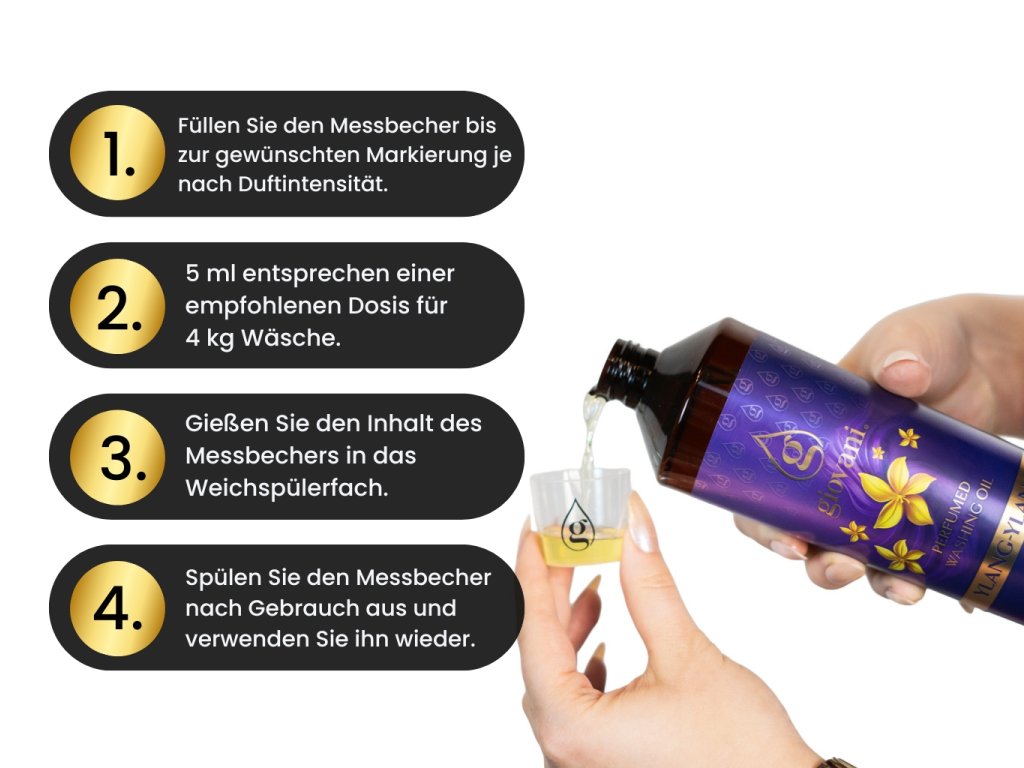 Wäschparfüms dazu. Auf dem Messbecher ist eine Skala, die nach Millilitern unterteilt ist, einschließlich einer Einkerbung für die 5-ml-Grenze, die einer gängigen Dosierung von Wäschparfüm für 4 kg Wäsche entspricht.