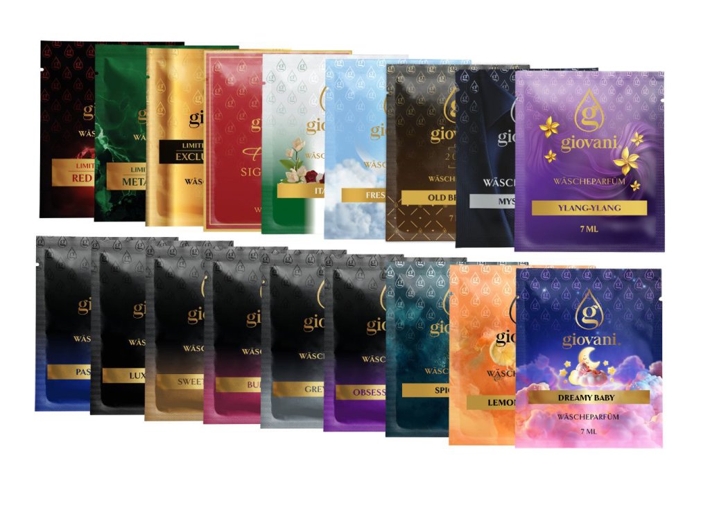 Giovani® ist eine exklusive und luxuriöse Marke für Wäscheparfüms. Auf ihre hohe Qualität haben wir besonders großen Wert gelegt. Bei der Entwicklung dieser Düfte war es uns wichtig, eine starke Intensität und eine lange Haltbarkeit zu erzielen, damit wir Giovani® als die hochwertigste Marke für Wäscheparfüms auf dem Markt bezeichnen können. Ihr großer Vorteil ist, dass sie die Waschmaschine nicht verstopfen, keinen schmierigen Belag und keine Flecken auf der Kleidung hinterlassen. Dank bestimmter Inhaltsstoffe pflegen unsere Öle auch die Farben Ihrer Wäsche. Sie sind vegan, enthalten kein Dioxan, kein Chlor, keine SVHC, Parabene, PBT/vPvB-Stoffe, Schwermetalle, schädliche Rückstände, Mikroplastik oder Nanoplastik. Die Einzigartigkeit der Marke Giovani® wird auch durch ihr luxuriöses Design unterstrichen. |