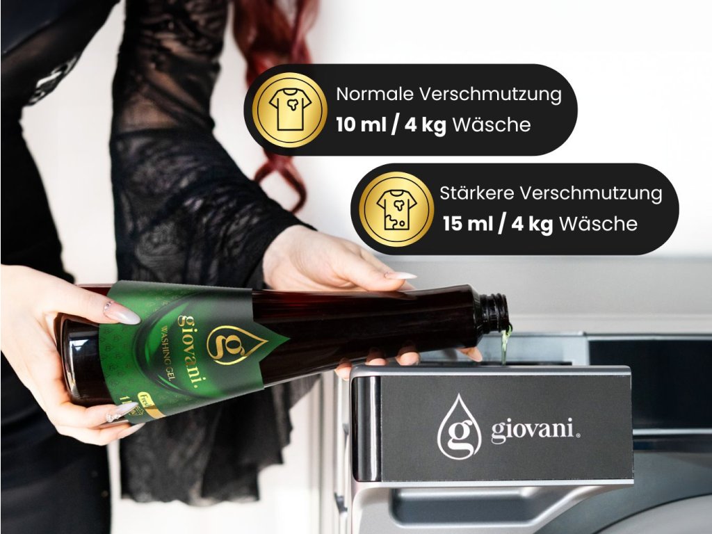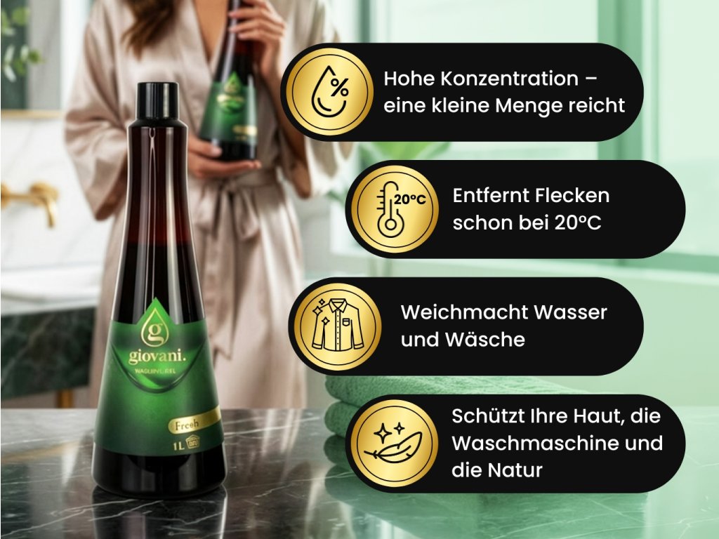 Waschen muss nicht nur eine lästige Pflicht sein. Mit dem Giovani® FRESH Wäschegel wird es zu einem erfrischenden Erlebnis. Dieses hochkonzentrierte Wäschegel reinigt Ihre Wäsche gründlich bereits bei niedriger Dosierung und niedriger Temperatur.