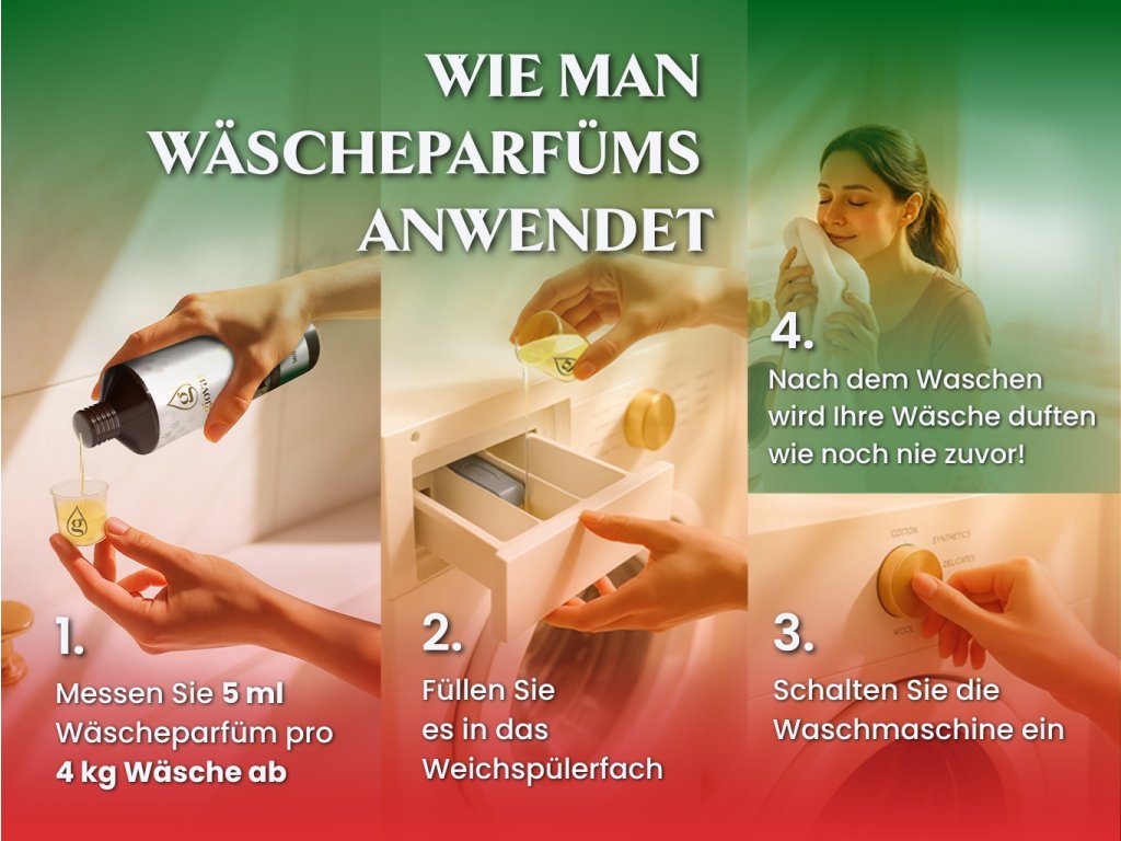 Geben Sie das Parfüm nicht in die Trommel der Waschmaschine oder in den Trockner. Sie sind direkt für die Verwendung im Weichspülerbehälter bestimmt. Sie müssen nicht befürchten, dass Ihre Wäsche nach dem Trocknen im Trockner ihren Duft verliert. Giovani®-Düfte sind resistent gegen äußere Einflüsse und langlebig. Die gewaschene Wäsche duftet auch nach dem Trocknen noch. Die optimale Temperatur für die Lagerung von Wäscheölen liegt bei ca. 15-25 Grad Celsius.
