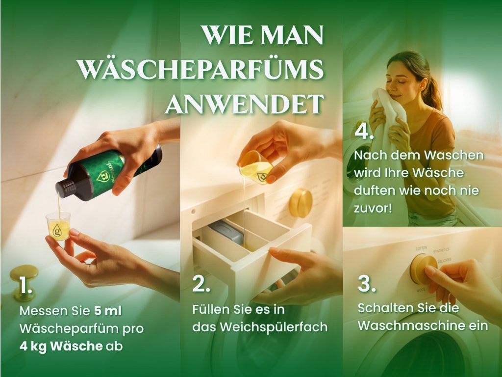 Geben Sie das Parfüm nicht in die Trommel der Waschmaschine oder in den Trockner. Sie sind direkt für die Verwendung im Weichspülerbehälter bestimmt. Sie müssen nicht befürchten, dass Ihre Wäsche nach dem Trocknen im Trockner ihren Duft verliert. Giovani®-Düfte sind resistent gegen äußere Einflüsse und langlebig. Die gewaschene Wäsche duftet auch nach dem Trocknen noch. Die optimale Temperatur für die Lagerung von Wäscheölen liegt bei ca. 15-25 Grad Celsius.