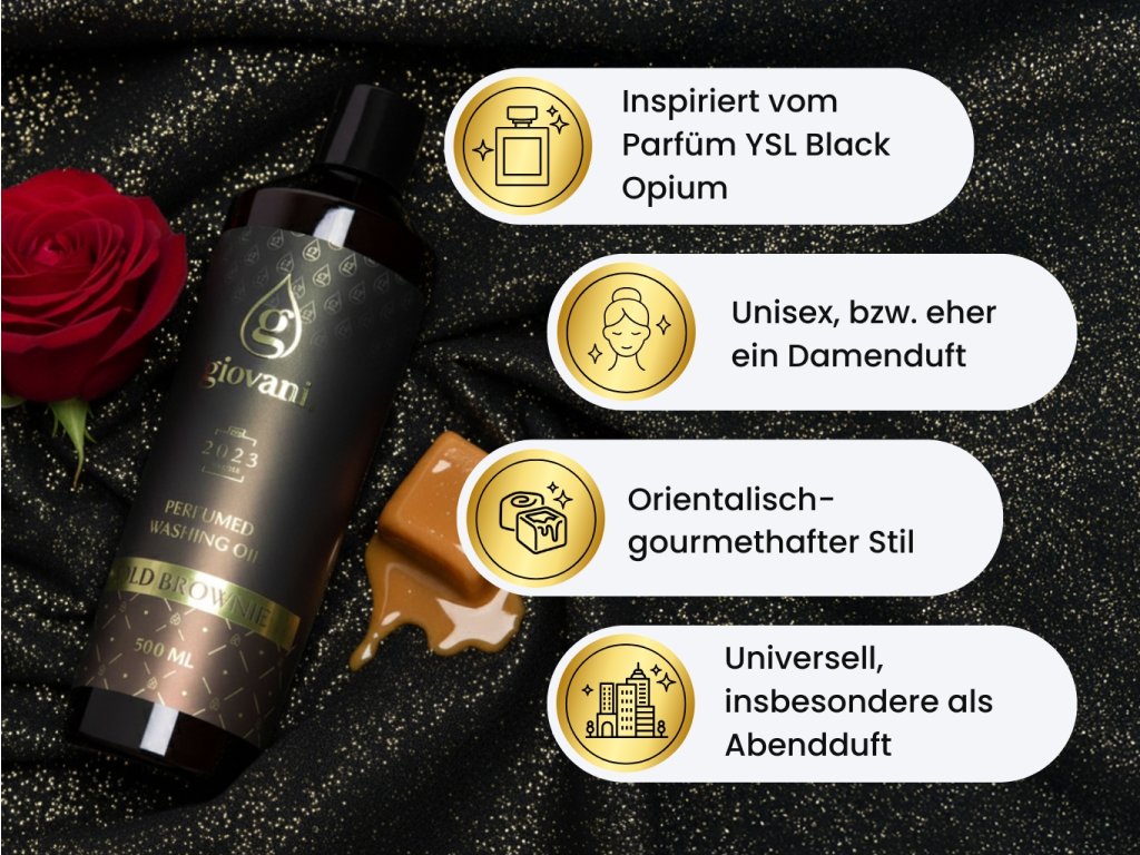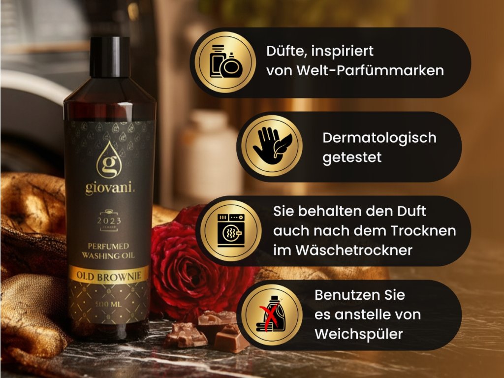 Giovani® ist eine exklusive und luxuriöse Marke für Waschparfums. Wir haben große Sorgfalt darauf verwendet, ihre hohe Qualität zu gewährleisten. Bei der Entwicklung dieser Düfte war es uns wichtig, eine starke Intensität und eine lange Haltbarkeit zu erreichen, so dass wir Giovani® als die beste Qualitätsmarke für Waschparfüms auf dem Markt bezeichnen können. Ihr großer Vorteil ist, dass sie die Waschmaschine nicht verstopfen, keine fettigen Rückstände hinterlassen und keine Flecken auf der Kleidung hinterlassen. Dank einiger Inhaltsstoffe sorgen unsere Öle auch für die Farbe Ihrer Wäsche. Sie sind vegan, frei von Dioxan, SVHC, Parabenen, PBT/vPvB-Stoffen, Schwermetallen, Schadstoffrückständen, Mikroplastik oder Nanoplastik. Die Einzigartigkeit der Marke Giovani® wird durch ihr luxuriöses Design unterstrichen. |