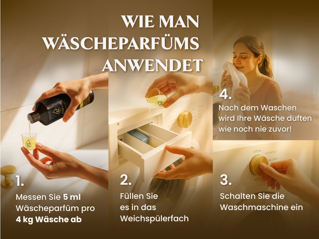 Geben Sie das Parfüm nicht in die Trommel der Waschmaschine oder in den Trockner. Sie sind direkt für die Verwendung im Weichspülerbehälter bestimmt. Sie müssen nicht befürchten, dass Ihre Wäsche nach dem Trocknen im Trockner ihren Duft verliert. Giovani®-Düfte sind resistent gegen äußere Einflüsse und langlebig. Die gewaschene Wäsche duftet auch nach dem Trocknen noch. Die optimale Temperatur für die Lagerung von Wäscheölen liegt bei ca. 15-25 Grad Celsius.