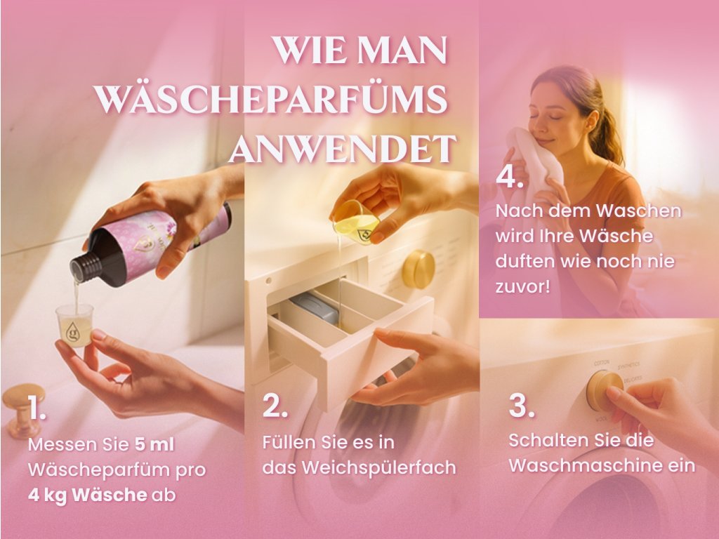 Anwendung: Geben Sie 5 ml des Konzentrats in den Weichspülerbehälter. Diese Menge entspricht einer Dosis für 4 kg Wäsche. Das Konzentrat wird nicht verdünnt. Zum Dosieren können Sie die Kappe vom Wäscheparfüm Giovani® verwenden, die 3 ml entspricht, wir empfehlen, die doppelte Menge zu verwenden. Damit das Dosieren noch bequemer wird, können Sie einen Messbecher mit unserem Logo oder eine Pumpe zum Dosieren erwerben. Verwenden Sie also nur eine kleine Menge und Ihre Wäsche wird perfekt parfümiert sein!